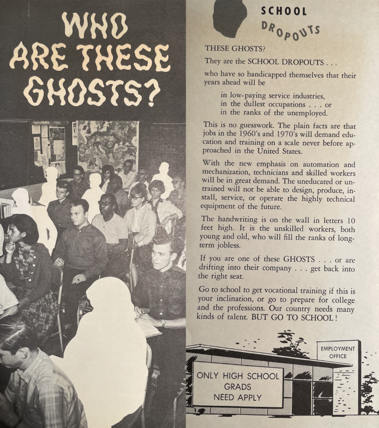 I’m half-joking with these fusty takes, but maybe there’s something there, something about how it’s a fiction to see some compressed, simple reality in the past, as if people in those times didn’t have troubles. Their collars were wider and they didn’t curse as much or as casually we do, but just look at that pamphlet. People dropping out of high school and straight-up turning into ghosts! I’d call that a real problem.